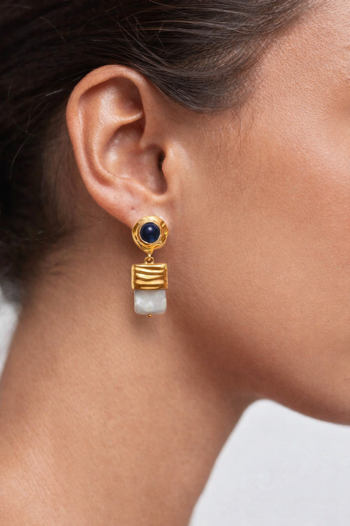 Asymmetrical earrings featuring stone imitation and cultured pearls — a refined statement with a subtle vintage allure.