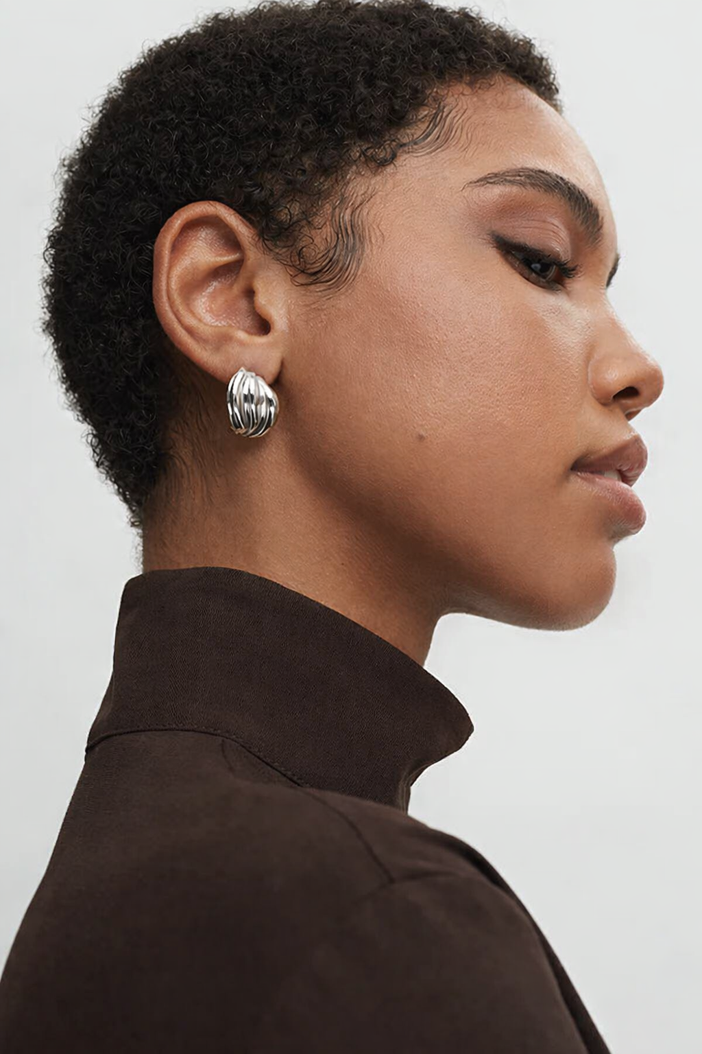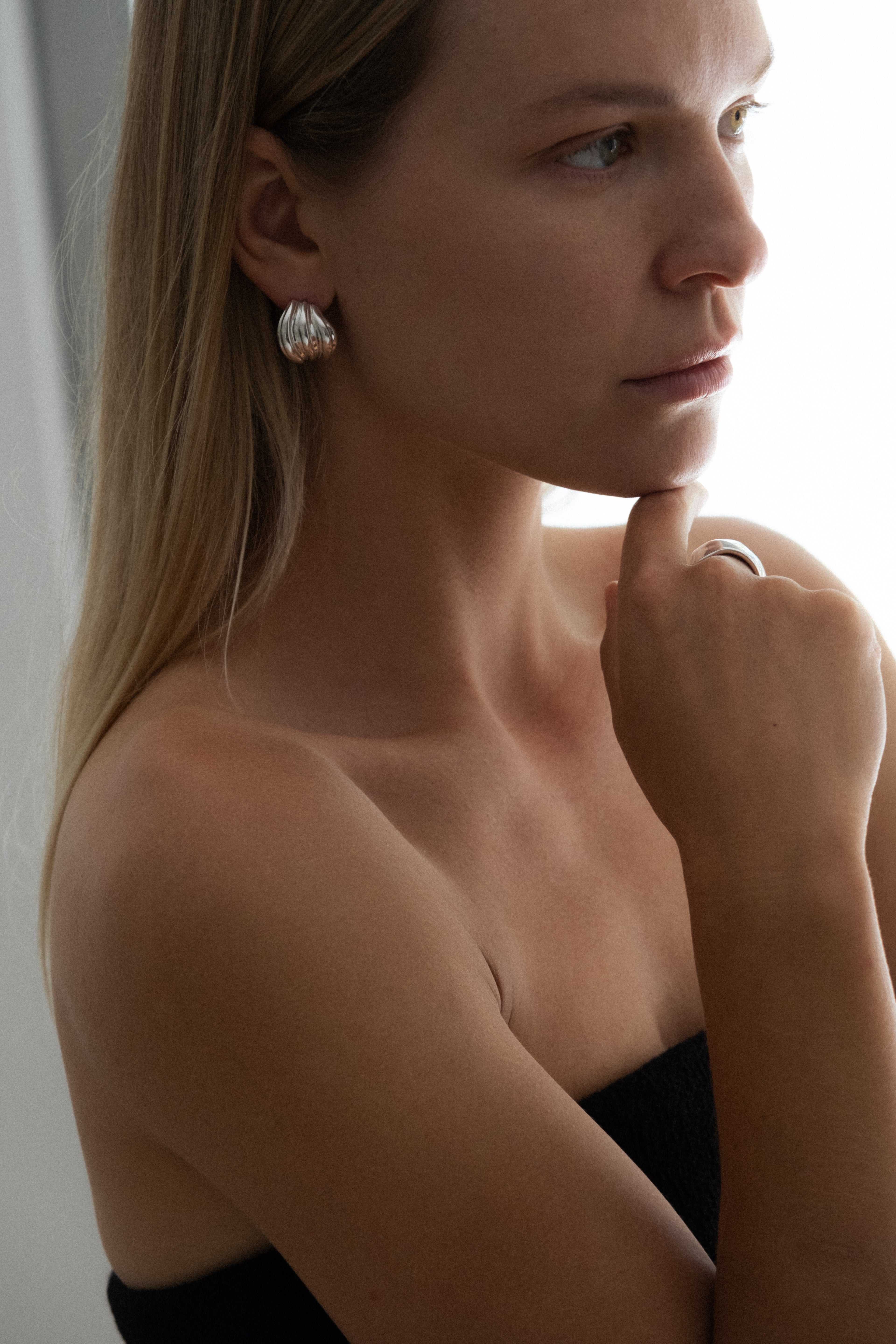 Sculptural earrings with a curvy design that reflects the movement of the silk fabric.
